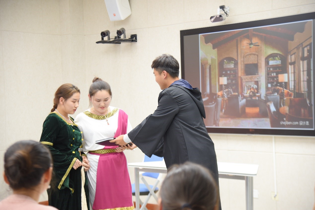 本次实践课以世界文学经典戏剧作品为主题,选择英国著名剧作家莎士比亚的《哈姆雷特》、《奥赛罗》和法国喜剧作家莫里哀的《伪君子》、《吝啬鬼》等四部剧作为实践课内容。学生在阅读理解上述作品的基础上,在外国文学史任课教师朝鲁孟其木格的指导下组建导演、编剧组、演员组、道具组、技术组,最终以微视频和舞台剧形式呈现。2018级1班柴拉干、乌尼日其其格、哈斯其木格、其乐木格等主演的舞台剧《吝啬鬼》和2018级2班西吉勒旁白,德格金、萨日盖、阿丽娅、格根哈斯等主演的舞台剧《伪君子》将吝啬鬼阿巴贡和伪君子答尔丢夫的形象生动再现,同时突出戏剧的喜剧特征。2018级2班德格金执导,邰清泉、金圆圆、阿丽娅、额登苏日德等主演的微视频《哈姆雷特》和2018级1班乌日查呼执导,曹敦、哈伦、香梅、巴亚力格、韩智光等主演的微视频《奥赛罗》不仅呈现原著的悲剧性,而且运用新技术,增加新元素令人耳目一新,印象深刻。课间两个班分别进行才艺表演活跃了课堂气氛。